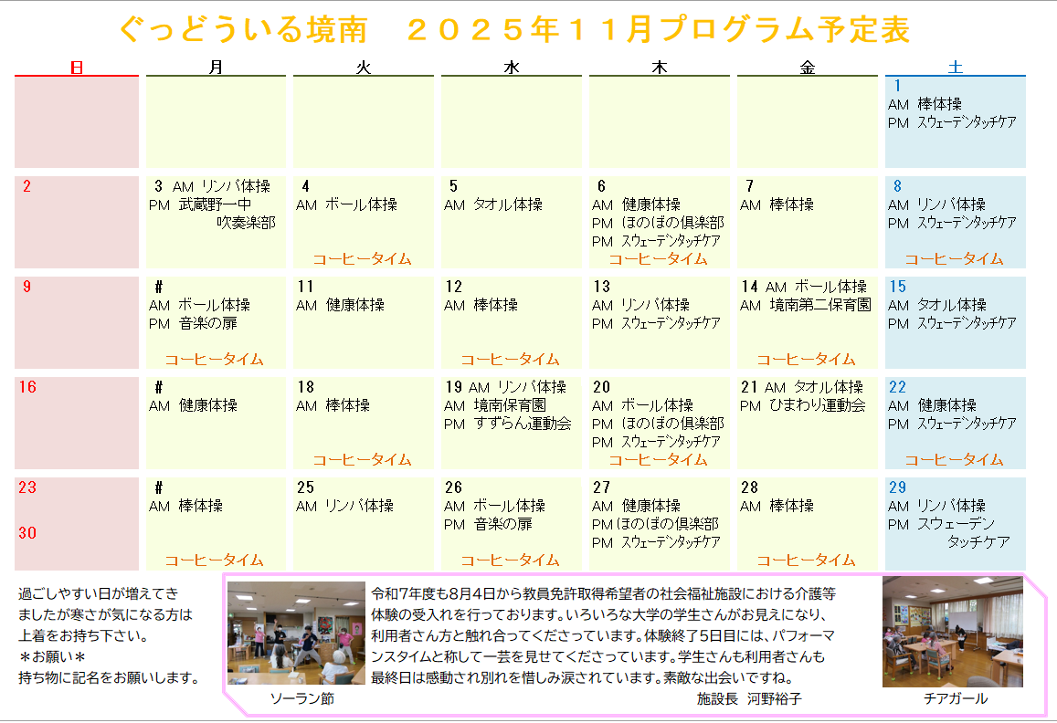 木曜日 | ・ほのぼのクラブ(音楽療法) ・タクティールケア ・ゲーム ・グループワーク |