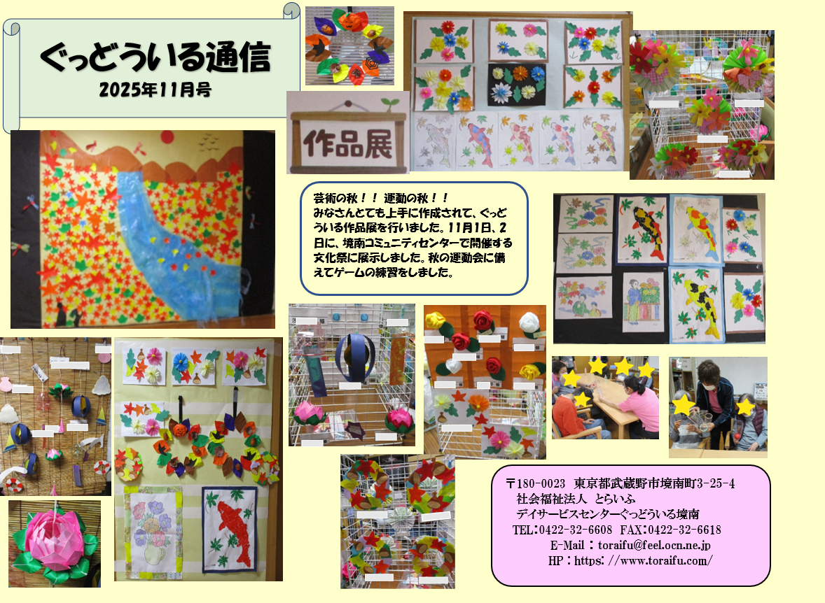 「毎日いきいきとした暮らしを続けられるよう支援」することを目的に、午前は日常生活動作向上のための健康体操(軽体操)など、午後は趣味・創作活動として手芸、パッチワーク、囲碁、将棋、オセロゲーム、書道、陶芸、ゲームやカラオケ、お菓子づくりなどのプログラムをご提供しています。