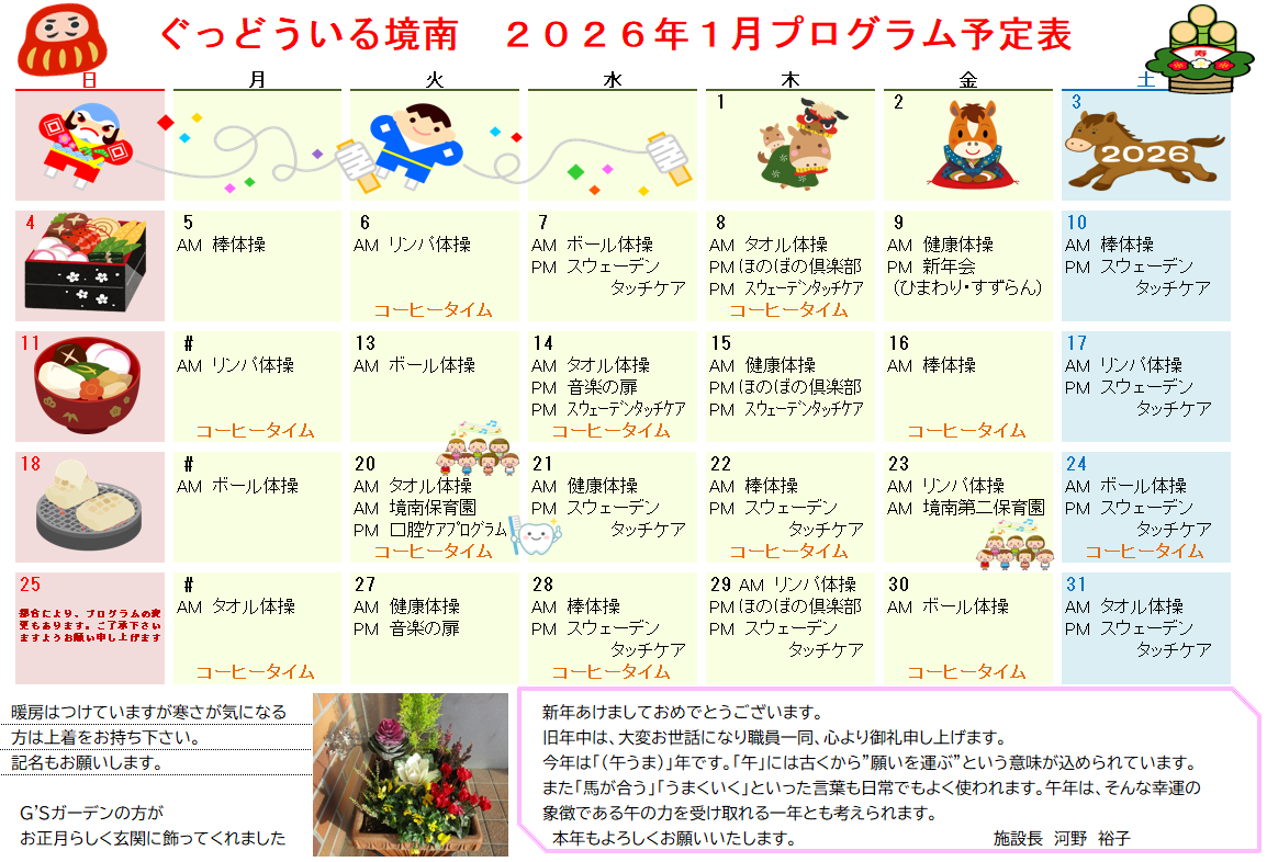土曜日 | ・タクティールケア ・ゲーム ・グループワーク ・外出(ドライブ) |