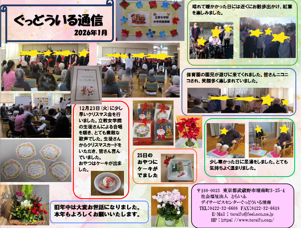 その他、 ミニコンサート(ピアノ、民謡、歌)、お散歩 などを実施しています。